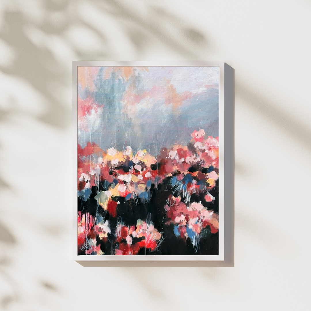 Dreaming of California is a layered original painting created with acrylic and oil on gallery-wrapped canvas. Inspired by the ebb and flow of our emotional landscape, this piece invites you to embrace the full spectrum of feeling—from longing and nostalgia to hope and surrender.