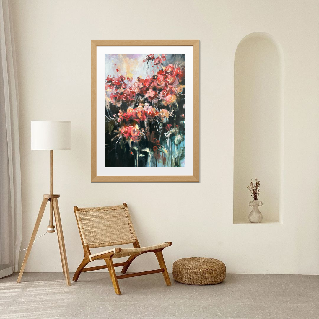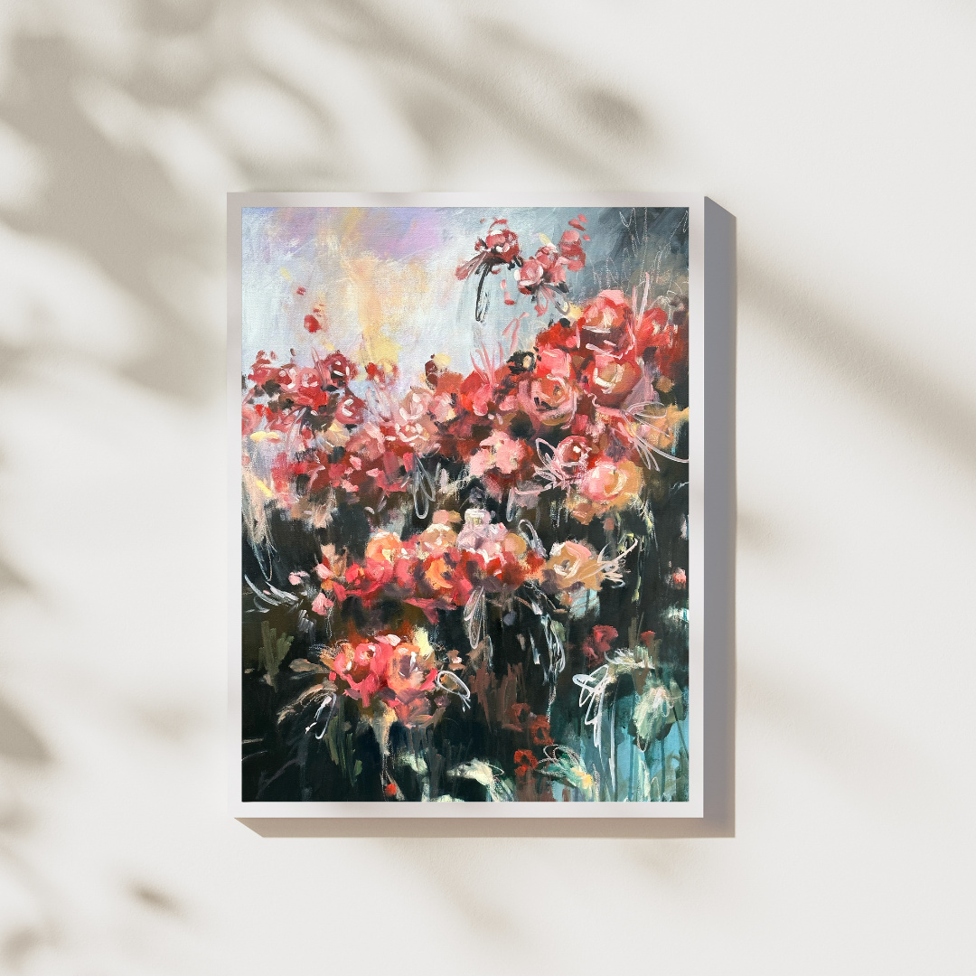 Perseverance is a 24x36 original painting created with acrylic and oil on gallery-wrapped canvas. Inspired by the tenacity of life to grow—even in the harshest conditions—this piece speaks to the strength found in softness, and the miracle of small beginnings.